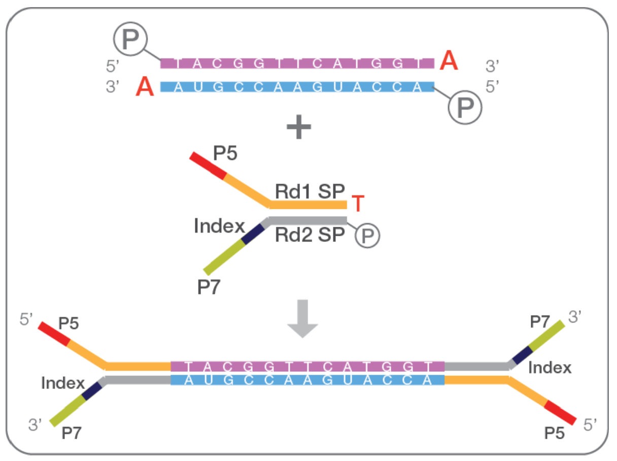 TA克隆加接头建库的方法是目前应用最广泛的建库技术,简单描述就是:将提取好的DNA片段化或者反转录的 cDNA,进行末端修复和加A尾,然后连接上接头(adapter),最后通过PCR扩增(可选),中间再穿插着纯化/分选步骤就完成了文库的构建。在这里,提前合成好的带T尾接头和末端带A的目的片段在DNA连接酶的作用下通过TA克隆方式连接(图1)。